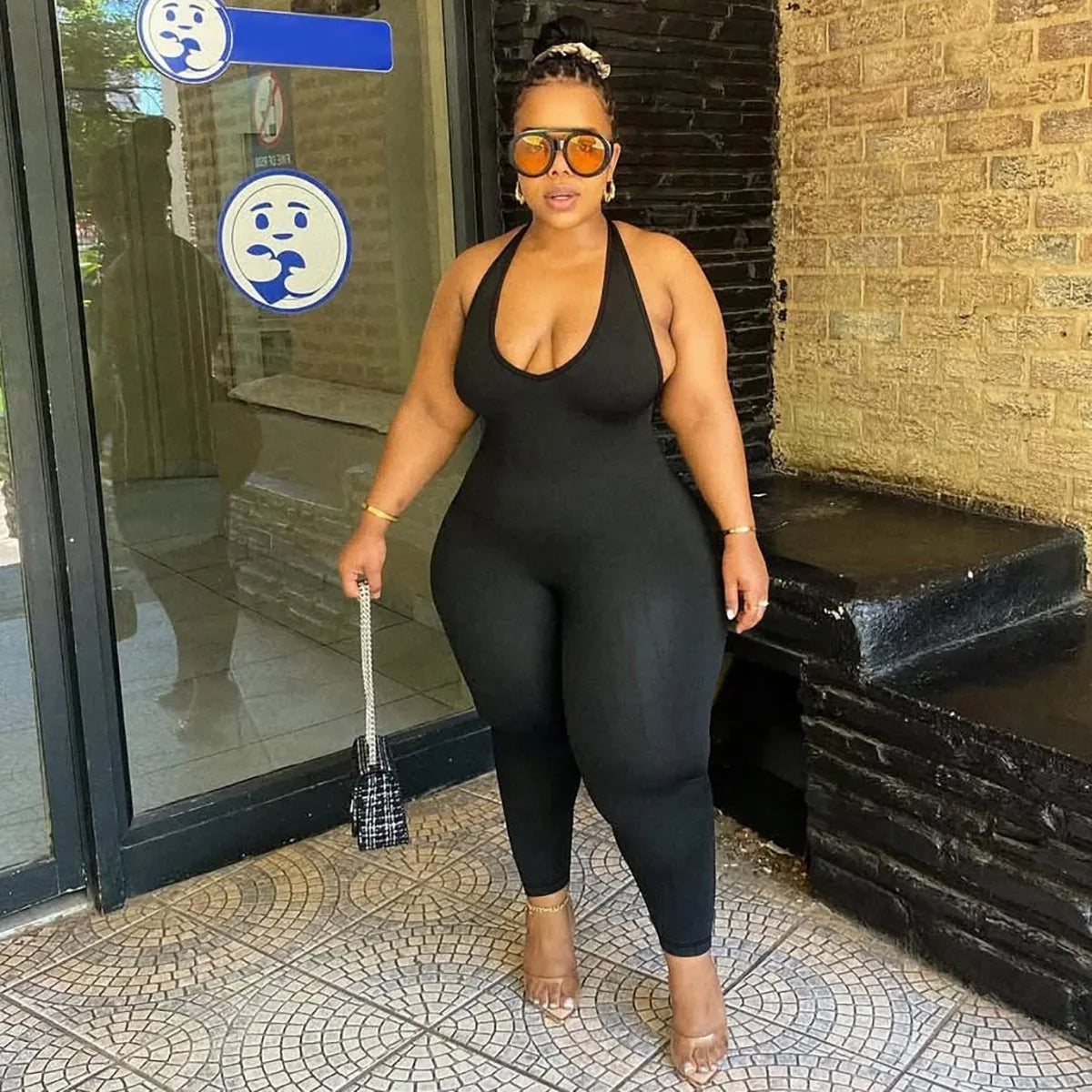 Plus Size Halter Solid Jumpsuit Female Casual V Neck Elegant Cloth Women One Piece Outfit 2024 Autumn Fashion Bodycon Jumpsuits