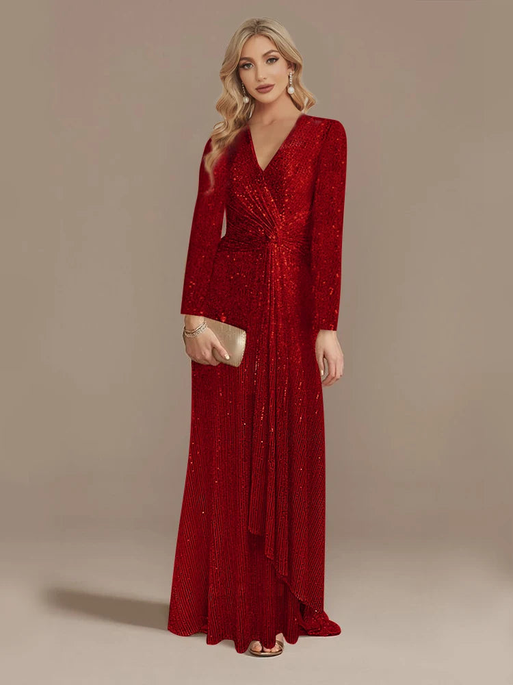 - Luxury Long Sleeve V-Neck Evening Dress Wedding Party Sequins For Women 2023 Female Guests Red Prom Cocktail Dresses